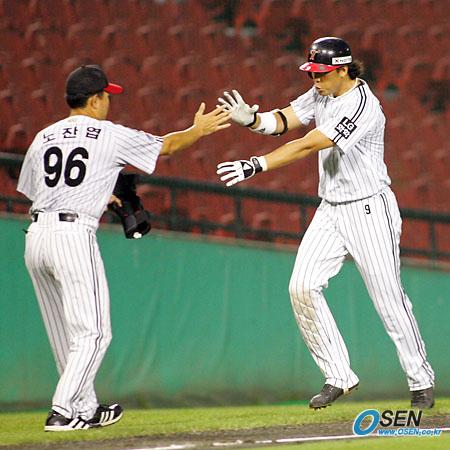18일 LG 트윈스와 현대 유니콘스의 잠실 경기 2회 말 2사 3루 때 이병규가 5-4로 전세를 뒤집는 역전 2점 홈런을 날리고 노찬엽 코치의 환영을 받으며 3루를 돌고 있다. /잠실= 주지영 기자 jj0jj0@osen.co.kr [Copyright ⓒ OSEN(www.osen.co.kr) 무단전재 및 재배포 금지]