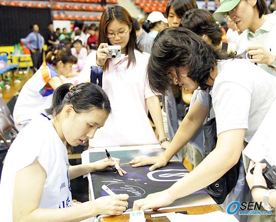 19일 서울 장충체육관에서 열린 신한은행배 2005 여자프로농구 여름리그 올스타전이 끝난 뒤 인기상을 받은 전주원이 한 팬이 내민 자신의 대형 브로마이드 사진에 싸인을 해주고 있다. /장충체=주지영 기자 jj0jj0@osen.co.kr [Copyright ⓒ OSEN(www.osen.co.kr) 무단전재 및 재배포 금지]