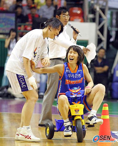 19일 장충체육관에서 열린 2005여자 프로농구 올스타전 도중 카트라이더 게임에서 세 발 자전거를 탄 김영옥이 앞을 가로막는 상대 선수를 밀치고 있다. /장충체=주지영 기자 jj0jj0@osen.co.kr [Copyright ⓒ OSEN(www.osen.co.kr) 무단전재 및 재배포 금지]