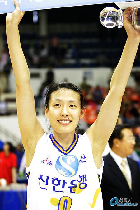 19일 신한은행배 2005 여자프로농구 여름리그 올스타전 인기상을 받은 남부팀의 전주원이 트로피를 들고 팬들에게 인사를 하고 있다. /장충체=주지영 기자 jj0jj0@osen.co.kr [Copyright ⓒ OSEN(www.osen.co.kr) 무단전재 및 재배포 금지]