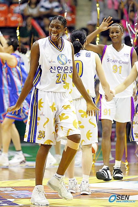19일 신한은행배 2005 여자프로농구 여름리그 올스타전은 중부팀이 변연하의 끝내기 3점포로 남부팀에 111-110의 짜릿한 역전 승리를 거두었다. 경기가 끝나고 남부팀인 신한은행의 켄트가 졌지만 재미있었는지 혀를 내밀고 있다./장충체=주지영 기자 jj0jj0@osen.co.kr [Copyright ⓒ OSEN(www.osen.co.kr) 무단전재 및 재배포 금지]
