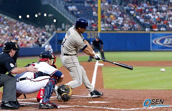 20일(한국시간) 터너필드에서 열린 애틀랜타 브레이브스와 원정경기에 선발 등판한 박찬호가 2회 1사 1, 3루에서 타석에 들어서 애틀랜타 선발 투수 마이크 햄튼을 상대로 좌전 적시타를 터뜨리고 있다. 박찬호는 이 안타로 지난 2001년 이후 4년만에 타점을 기록했다. /애틀랜타(미국 조지아주)=news&image 특약 [Copyright ⓒ OSEN(www.osen.co.kr) 무단전재 및 재배포 금지]