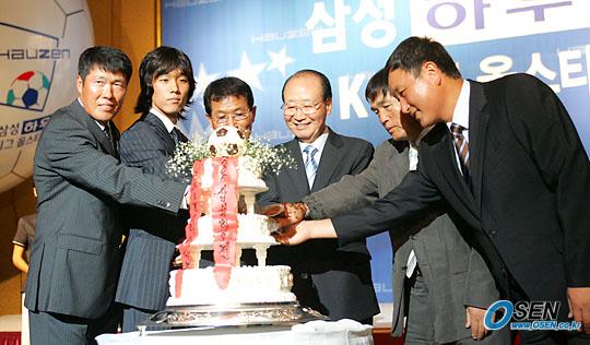 20일 오후 5시부터 서울 홍은동 그랜드힐튼호텔에서 열린 K-리그 올스타전 전야제에서 차범근 감독, 박주영, 차경복 감독, 곽정환 프로축구연맹회장, 이회택 추구협회 기술위원장, 허정무 감독(왼쪽부터)이 케이크 커팅을 하고 있다./주지영 기자 jj0jj0@osen.co.kr [Copyright ⓒ OSEN(www.osen.co.kr) 무단전재 및 재배포 금지]