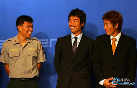20일 오후 5시부터 서울 홍은동 그랜드힐튼호텔에서 열린 2005삼성 하우젠 K-리그 올스타전 전야제에서 올스타 남부팀의 정경호와 이동국, 김정우가 단상에 나란히 서서 웃으며 이야기를 하고 있다. /주지영 기자 jj0jj0@osen.co.kr [Copyright ⓒ OSEN(www.osen.co.kr) 무단전재 및 재배포 금지]
