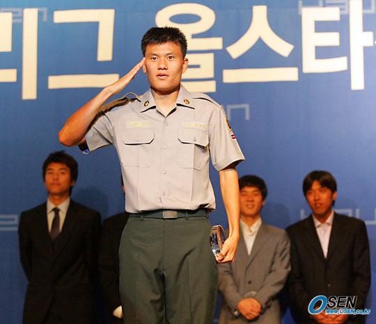 20일 오후 5시부터 서울 홍은동 그랜드힐튼호텔에서 열린 2005삼성 하우젠 K-리그 올스타전 전야제에서 올스타 남부팀 정경호가 군인답게 거수경례를 하고 있다./주지영 기자 jj0jj0@osen.co.kr [Copyright ⓒ OSEN(www.osen.co.kr) 무단전재 및 재배포 금지]