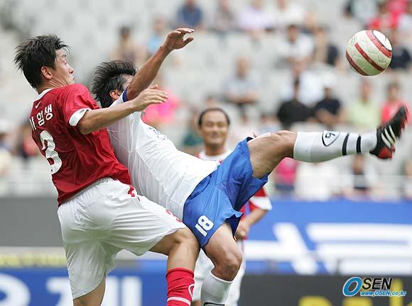 21일 서울 상암월드컵구장에서 벌어진 삼성 하우젠 K-리그올스타전에 앞서 벌어진 올드스타전 남부팀의 황선홍 전남코치가 중부팀 이임생을 등지고 오버헤드킥을 시도하고 있다. 황선홍은 이임생의 반칙으로 페널티킥을 얻어내 손수 차 넣어 첫 골을 기록했다./상암=손용호 기자 spjj@osen.co.kr [Copyright ⓒ OSEN(www.osen.co.kr) 무단전재 및 재배포 금지]