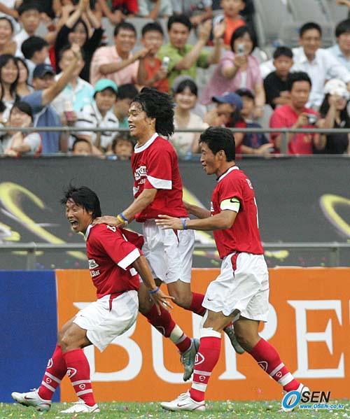 21일 서울 상암 월드컵 경기장에서 벌어진 2005삼성 하우젠 K-리그 올스타전에서 중부팀 박주영이 전반 12분 자신이 얻어낸 페널티킥을 가볍게 차 넣어 첫 골을 터뜨린 뒤 세리머리를 하기 위해 최성용의 등에 올라타고 있다./상암=손용호기자s pjj@osen.co.kr [Copyright ⓒ OSEN(www.osen.co.kr) 무단전재 및 재배포 금지]