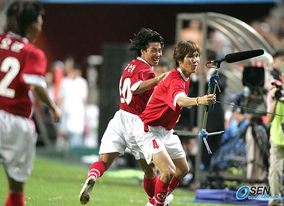 21일 서울 상암 월드컵경기장에서 열린 2005삼성 하우젠 K-리그 올스타전에서 후반 시작 직후 중부팀 공오균이 2-2 동점골을 터뜨리자 김동진(오른쪽)과 최성용이 '기관총 세레머니'를 하기위해 방송용 마이크를 들고 뛰어가다 줄이 짧아 걸리고 있다./상암=손용호기자 spj@osen.co.kr [Copyright ⓒ OSEN(www.osen.co.kr) 무단전재 및 재배포 금지]