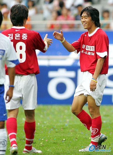 21일 서울 상암월드컵경기장에서 열린 2005삼성 하우젠 K-리그 올스타전에서 경기 시작 전 박주영이 김은중과 악수를 나누며 서로를 격려하고 있다./상암=주지영 기자 jj0jj0@osen.co.kr [Copyright ⓒ OSEN(www.osen.co.kr) 무단전재 및 재배포 금지]