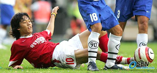 21일 서울 상암 월드컵경기장에서 열린 2005삼성 하우젠 K-리그 올스타전에서 경기 전반 박주영이 이장관의 태클에 걸려 넘어지면서도 끝까지 공을 뺏으려하고 있다. /상암=주지영 기자 jj0jj0@osen.co.kr [Copyright ⓒ OSEN(www.osen.co.kr) 무단전재 및 재배포 금지]