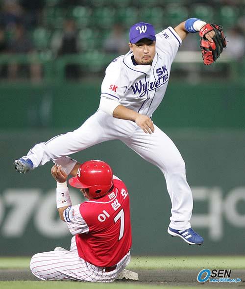 23일 문학구장에서 벌어진 SK 와이번스와 한화 이글스의 경기. 한화 6회초 공격, 무사 1, 2루에서 브리또가 두 차례의 번트를 실패해 강공을 했지만 내야땅볼을 쳐내 1루주자 이범호가 2루에서 아웃당하고 있다. SK 2루수는 정경배가 멋진 폼으로 1루로 송구, 더블아웃시키고 있다. /문학=손용호 기자 spjj@osen.co.kr [Copyright ⓒ OSEN(www.osen.co.kr) 무단전재 및 재배포 금지]