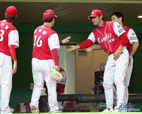 23일 문학구장에서 벌어진 SK 와이번스와 한화 이글스의 경기 1-1 동점이던 SK의 9회말 2사 1,2루에서 마운드를 내려온 선발 투수 문동환을 덕아웃에 있던 조성민이 격려하고 있다. 그러나 이어 나온 차명주가 이진영에게 끝내기 안타를 맞아 결국 문동환은 패전투수가 됐다./인천=손용호 기자 spjj@osen.co.kr [Copyright ⓒ OSEN(www.osen.co.kr) 무단전재 및 재배포 금지]
