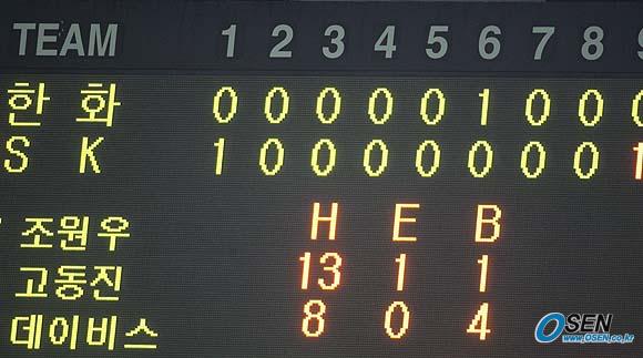 23일 문학구장에서 벌어진 SK 와이번스와 한화 이글스의 경기 한화는 13안타를 쳤지만 1득점에 그쳐 8⅔이닝동안 2실점한 선발 투수 문동환의 역투를 물거품으로 만들었다. 한화는 9회말 2사 1,2루에서 이진영에게 끝내기 안타를 맞아 패했다./인천=손용호 기자 spjj@osen.co.kr [Copyright ⓒ OSEN(www.osen.co.kr) 무단전재 및 재배포 금지]