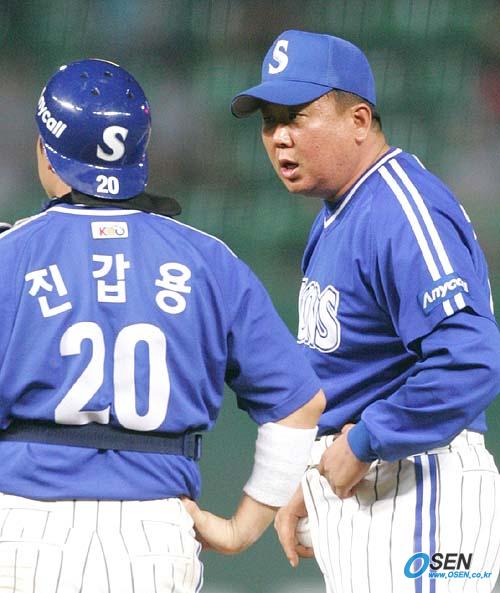 26일 문학구장에서 벌어진 SK 와이번스와 삼성 라이온즈의 경기 SK의 8회말 2사 만루서 선발 투수 배영수가 박경완을 상대로 볼카운트 2-1에서 자신없는 투구를 하자 마운드에 직접 나와 교체시킨 선동렬 삼성 감독이 포수 진갑용에게 투수 리드에 대해 질책하고 있다./인천=손용호 기자 spjj@osen.co.kr [Copyright ⓒ OSEN(www.osen.co.kr) 무단전재 및 재배포 금지]