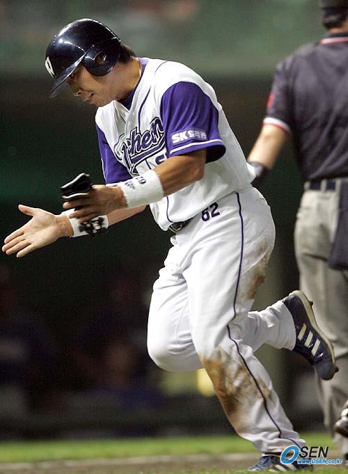 27일 문학구장에서 벌어진 SK 와이번스와 삼성 라이온즈의 경기 SK의 4회말 2사 3루 3루주자 박재홍이 삼성투수 바르가스의 인터벌이 길자 단독 홈스틸을 시도, 서서 들어와 선취점을 뽑아내고 박수를 치며 좋아하고 있다./인천=손용호 기자 spjj@osen.co.kr [Copyright ⓒ OSEN(www.osen.co.kr) 무단전재 및 재배포 금지]