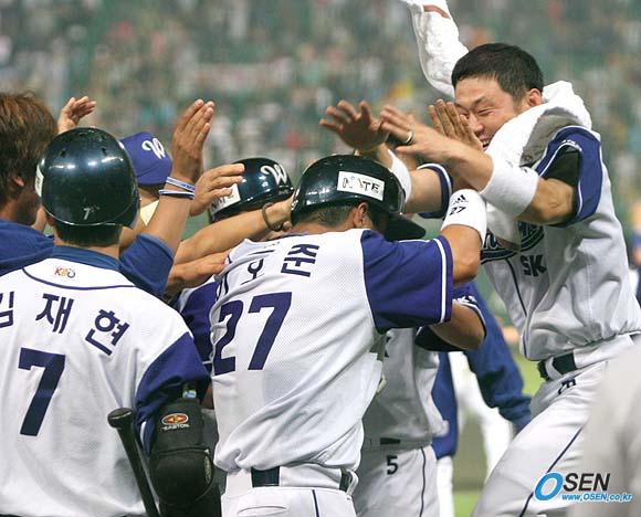 27일 문학구장에서 벌어진 SK 와이번스와 삼성 라이온즈의 경기 2-3으로 뒤지던 SK의 9회말 무사 1루서 동점 2루타를 친 뒤 최정의 내야 안타때 홈을 밟아 재역전 결승점을 올린 이호준(오른쪽에서 두 번째)을 동료들이 두드려(?) 주고 있다./인천=손용호 기자 spjj@osen.co.kr [Copyright ⓒ OSEN(www.osen.co.kr) 무단전재 및 재배포 금지]