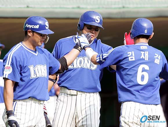 28일 문학구장에서 벌어진 SK 와이번스와 삼성 라이온즈의 경기 삼성의 6회초 선두타자로 나온 김재걸이 좌중간 펜스를 넘기는 솔로 홈런을 치고 들어오자 삼성의 대표적 홈런타자인 심정수(왼쪽)와 양준혁(가운데)이 맞이하고 있다./인천=손용호 기자 spjj@osen.co.kr [Copyright ⓒ OSEN(www.osen.co.kr) 무단전재 및 재배포 금지]