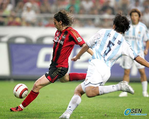 28일 서울 상암 월드컵경기장에서 벌어진 FC 서울과 울산 현대의 경기 후반 서울의 히칼도가 골키퍼와 1-1로 맞선 찬스에서 강슛을 날리고 있다. 그러나 울산 골키퍼 서동명이 쳐냈다. 서동명은 전반에도 히칼도의 페널티킥을 막아냈다./상암=손용호 기자 spjj@osen.co.kr [Copyright ⓒ OSEN(www.osen.co.kr) 무단전재 및 재배포 금지]