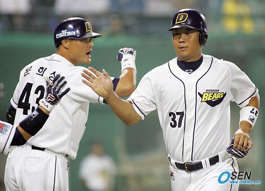 30일 두산 베어스와 LG 트윈스의 잠실 경기 3-3이던 두산의 5회말 2사 만루 김동주 타석 때 상대 투수 심수창의 폭투로 역전 득점을 올린 장원진(오른쪽)이 문희성의 환영을 받으며 덕아웃으로 향하고 있다./잠실=주지영 기자 jj0jj0@osen.co.kr [Copyright ⓒ OSEN(www.osen.co.kr) 무단전재 및 재배포 금지]