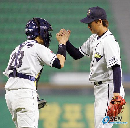 30일 두산 베어스와 LG 트윈스의 잠실 경기서 7-4로 역전승한 두산의 포수 용덕한과 마무리 투수 정재훈이 경기 후 손을 굳게 맞잡고 있다./잠실=주지영 기자 jj0jj0@osen.co.kr [Copyright ⓒ OSEN(www.osen.co.kr) 무단전재 및 재배포 금지]