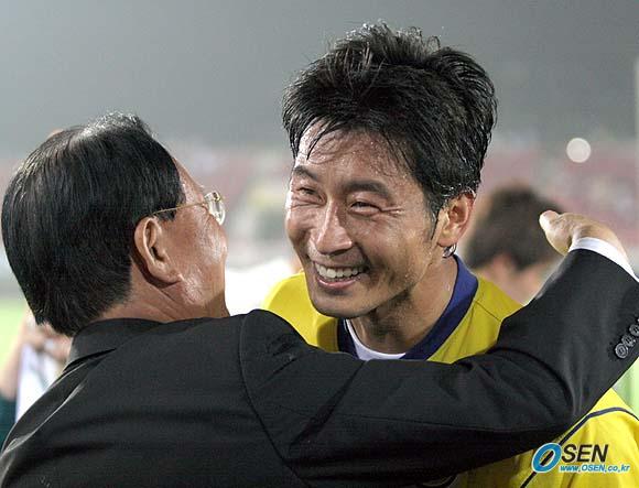 31일 성남 제2종합운동장에서 벌어진 성남 일화와 인천 유나이티드의 경기서 성남의 김도훈이 0-1로 뒤지던 후반 혼자 3골을 몰아쳐 해트트릭을 수립하며 개인 통산 최다 득점 신기록(113골)을 달성했다. 김도훈이 경기 후 박규남 사장과 포옹하고 있다./성남=손용호 기자 spjj@osen.co.kr [Copyright ⓒ OSEN(www.osen.co.kr) 무단전재 및 재배포 금지]