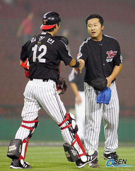 31일 두산 베어스와 LG 트윈스의 잠실 경기서 3-2로 이긴 LG의 최고참 포수 김정민과 마무리 투수 경헌호가 악수를 나누며 승리를 자축하고 있다./잠실=주지영 기자 jj0jj0@osen.co.kr [Copyright ⓒ OSEN(www.osen.co.kr) 무단전재 및 재배포 금지]