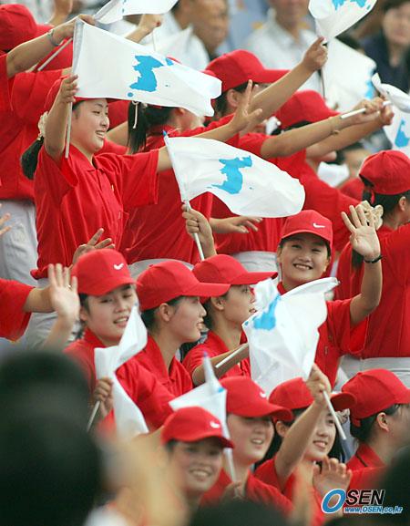 제16회 아시아육상선수권대회 첫 날 경기가 1일 인천 문학 월드컵경기장에서 열렸다. 북측 청년학생협력단원이 한 손에는 한반도기를 들고 한 손으로 남측 관중들에게 손을 흔들며 인사하고 있다./인천=주지영 기자 jj0jj0@osen.co.kr [Copyright ⓒ OSEN(www.osen.co.kr) 무단전재 및 재배포 금지]