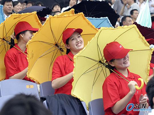 제16회 아시아육상선수권대회 첫 날 경기가 1일 인천 문학 월드컵경기장에서 열렸다. 북측 청년학생협력단원들이 우산을 갖고 음악에 맞춰 몸을 흔들며 응원하고 있다./인천=주지영 기자 jj0jj0@osen.co.kr [Copyright ⓒ OSEN(www.osen.co.kr) 무단전재 및 재배포 금지]