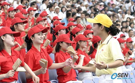 제16회 아시아육상선수권대회 첫 날 경기가 1일 인천 문학 월드컵경기장에서 열렸다. 북측 청년학생협력단원들이 리더의 지시에 따라 '딱딱이'로 응원을 선보이고 있다./인천=주지영 기자 jj0jj0@osen.co.kr [Copyright ⓒ OSEN(www.osen.co.kr) 무단전재 및 재배포 금지]