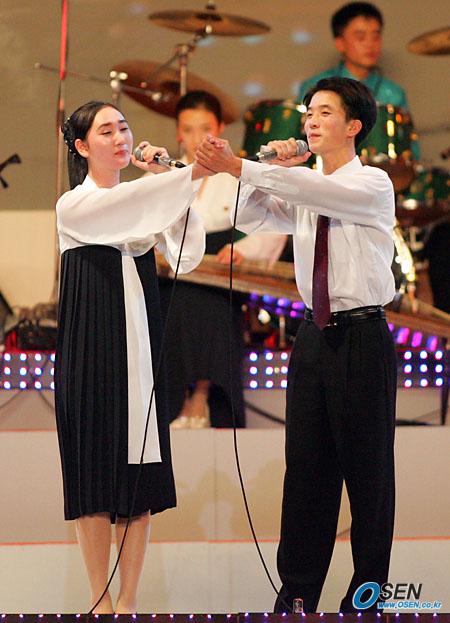 인천 문학 월드컵경기장에서 1일 시작된 제16회 아시아육상선수권대회 응원을 위해 입국한 북측 청년학생협력단이 이날 저녁 7시 30분부터 문학 야구장에서 공연을 가졌다. 남녀 단원이 오른손에는 마이크를 들고 왼손은 서로 잡고 노래를 부르고 있다./인천=주지영 기자 jj0jj0@osen.co.kr [Copyright ⓒ OSEN(www.osen.co.kr) 무단전재 및 재배포 금지]