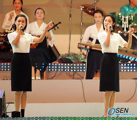인천 문학 월드컵경기장에서 1일 시작된 제16회 아시아육상선수권대회 응원을 위해 입국한 북측 청년학생협력단이 이날 저녁 7시 30분부터 문학 야구장에서 공연을 가졌다. 여성 단원 둘이 남과 북은 하나라며 손가락을 일자로 세운 채 노래하고 있다./인천=주지영 기자 jj0jj0@osen.co.kr [Copyright ⓒ OSEN(www.osen.co.kr) 무단전재 및 재배포 금지]