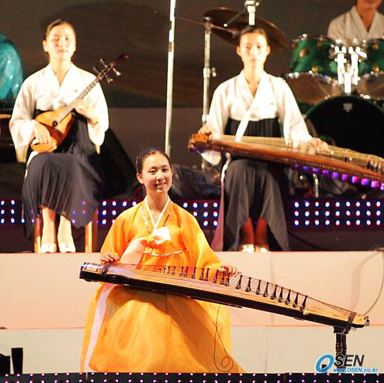 인천 문학 월드컵경기장에서 1일 시작된 제16회 아시아육상선수권대회 응원을 위해 입국한 북측 청년학생협력단이 이날 저녁 7시 30분부터 문학 야구장에서 공연을 가졌다. 여성 단원이 가야금을 연주하고 있다./인천=주지영 기자 jj0jj0@osen.co.kr [Copyright ⓒ OSEN(www.osen.co.kr) 무단전재 및 재배포 금지]