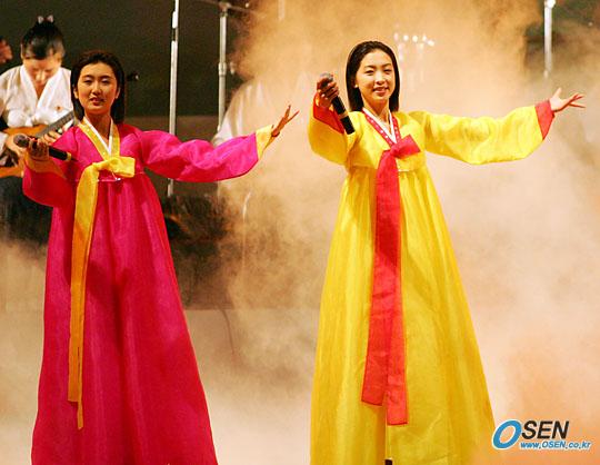 인천 문학 월드컵경기장에서 1일 시작된 제16회 아시아육상선수권대회 응원을 위해 입국한 북측 청년학생협력단이 이날 저녁 7시 30분부터 문학 야구장에서 공연을 가졌다. 한복 차림의 두 여성 단원이 춤추며 공연하고 있다. /인천=주지영 기자 jj0jj0@osen.co.kr [Copyright ⓒ OSEN(www.osen.co.kr) 무단전재 및 재배포 금지]