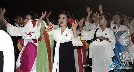 인천 문학 월드컵경기장에서 1일 시작된 제16회 아시아육상선수권대회 응원을 위해 입국한 북측 청년학생협력단이 이날 저녁 7시 30분부터 문학 야구장에서 공연을 가졌다. 공연을 마친 단원들이 경기장을 빠져 나가면서 관중들에게 인사하고 있다./인천=주지영 기자 jj0jj0@osen.co.kr [Copyright ⓒ OSEN(www.osen.co.kr) 무단전재 및 재배포 금지]
