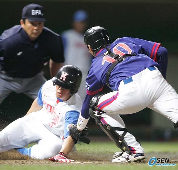 2일 인천 문학구장에서 벌어진 아시아 청소년 야구선수권대회 한국과 대만의 경기 5회말 1사 1,3루서 1루주자 장준환이 1, 2루 사이에서 런다운에 걸렸을 때 3루주자 김준무가 홈을 파고 들었으나 태그아웃되고 있다. 대만 포수는 린춘성./인천=손용호 기자 spjj@osen.co.kr [Copyright ⓒ OSEN(www.osen.co.kr) 무단전재 및 재배포 금지]