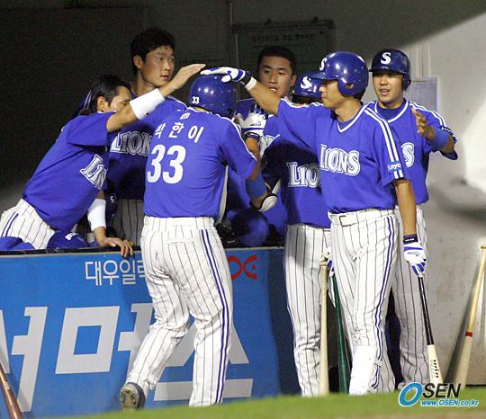 2일 두산 베어스와 삼성 라이온즈의 잠실경기 삼성의 7회초 2사 1,3루서 심정수의 적시타로 홈을 밟아 동점을 만든 박한이가 덕아웃의 동료들로부터 환영 받고 있다./잠실=주지영 기자 jj0jj0@osen.co.kr [Copyright ⓒ OSEN(www.osen.co.kr) 무단전재 및 재배포 금지]