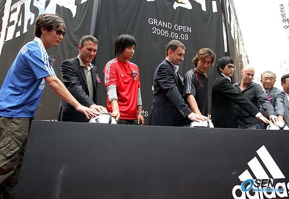 3일 오후 서울 명동의 아디다스 코리아 직영점 오픈 행사에 많은 축구인과 연예인이 참가, 성황을 이뤘다. 왼쪽으로부터 수원 삼성의 송종국, 위르겐 슈트라페 아디다스 아태본부 부사장, 영화배우 강동원, 볼프강 벤트하이머 아디다스 코리아 대표, 울산 현대의 유상철, 수원 삼성의 김남일 , 폴 하디스티 아디다스 코리아 상무 등 참석자들이 휘장을 제거하기 위해 축구공 모양 버튼을 누르고 있다./손용호 기자spjj@osen.co.kr [Copyright ⓒ OSEN(www.osen.co.kr) 무단전재 및 재배포 금지]
