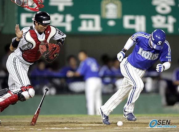3일 잠실구장에서 벌어진 LG 트윈스와 삼성 라이온즈의 경기 5회초 삼성 공격 무사 1,2루에서 김재걸의 보내기 번트 타구를 LG 포수 김정민이 마스크를 집어던지며 잡으려하고 있다. 2루 주자를 3루에서 아웃시킬 수도 있는 타이밍이었지만 문승훈 주심은 공이 홈플레이트에 맞았다며 파울을 선언했다. /잠실=손용호기자spjj@osen.co.kr [Copyright ⓒ OSEN(www.osen.co.kr) 무단전재 및 재배포 금지]