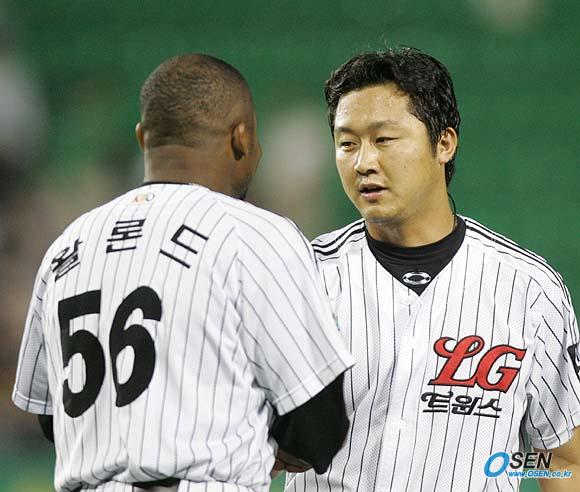 3일 잠실야구장에서 벌어진 LG 트윈스와 삼성 라이온즈의 경기서 LG가 삼성에 6-3으로 재역전승을 거뒀다.경기 후 승리투수가 되며 9연패서 탈출한 선발투수 왈론드가 세이브를 따낸 마무리 투수 경헌호(오른쪽)를 반갑게 맞이하고 있다./잠실=손용호 기자 spjj@osen.co.kr [Copyright ⓒ OSEN(www.osen.co.kr) 무단전재 및 재배포 금지]