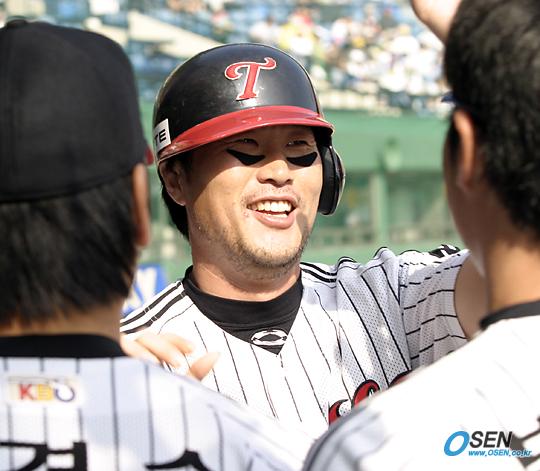 4일 LG 트윈스와 삼성 라이온즈의 잠실 경기 LG의 4회말 2사 2루서 권용관의 2루타로 홈을 밟아 4-4 동점이 된 뒤 최동수가 동료들과 기뻐하고 있다./잠실= 주지영 기자 jj0jj0@osen.co.kr [Copyright ⓒ OSEN(www.osen.co.kr) 무단전재 및 재배포 금지]