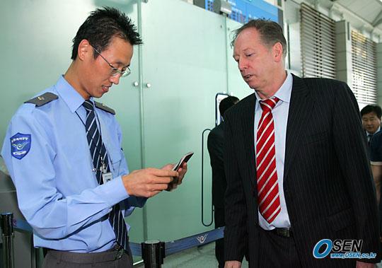 한국 축구대표팀 감독을 사임한 본프레레 감독이 8일 낮 12시 45분 인천공항발 네델란드 항공편으로 한국을 떠났다. 본프레레 감독이 출국장에 들어가기 앞서 여권 검사를 받고 있다./인천=주지영 기자 jj0jj0@osen.co.kr [Copyright ⓒ OSEN(www.osen.co.kr) 무단전재 및 재배포 금지]