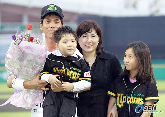 8일 현대 유니콘스와 두산 베어스의 수원 경기에 앞서 사상 첫 통산 500도루를 달성한 현대 전준호에 대한 구단의 시상 행사가 있었다. 전준호(37)의 부인과 아들 딸이 그라운드로 나와 꽃다발을 전달한 뒤 함께 기념사진을 찍고 있다./수원=주지영 기자 jj0jj0@osen.co.kr [Copyright ⓒ OSEN(www.osen.co.kr) 무단전재 및 재배포 금지]