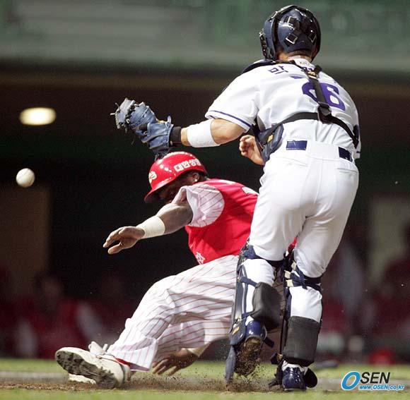 8일 문학구장에서 벌어진 SK 와이번스와 한화 이글스의 경기 한화의 3회초 1사 1,3루 이도형의 유격수 땅볼때 3루주자 데이비스가 늦게 스타트했으나 SK 유격수 김민재의 송구가 포수 박경완의 글러브를 맞고 튀며 세이프되고 있다./인천=손용호 기자 spjj@osen.co.kr [Copyright ⓒ OSEN(www.osen.co.kr) 무단전재 및 재배포 금지]