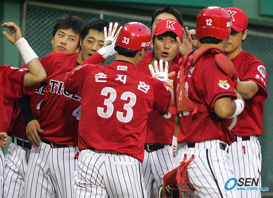 10일 두산 베어스와 기아 타이거즈의 잠실 경기 기아의 1회초 2사 3루서 손지환이 좌월 투런 홈런을 날린 뒤 덕아웃의 동료들로부터 환영을 받고 있다./잠실=주지영 기자 jj0jj0@osen.co.kr [Copyright ⓒ OSEN(www.osen.co.kr) 무단전재 및 재배포 금지]