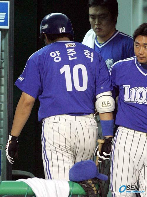 10일 대전구장에서 열린 한화 이글스와 삼성 라이온즈의 경기 삼성이 1-2로 뒤지고 있던 5회초 1사 1,2루 양준혁 타석 때 한화 우완 선발 투수 김해님이 계속 던지고 있는 상황에서 벤치가 김종훈을 대타로 내자 양준혁이 방망이를 챙겨 들고 덕아웃 밖으로 나가고 있다./대전=손용호 기자 spjj@osen.co.kr [Copyright ⓒ OSEN(www.osen.co.kr) 무단전재 및 재배포 금지]
