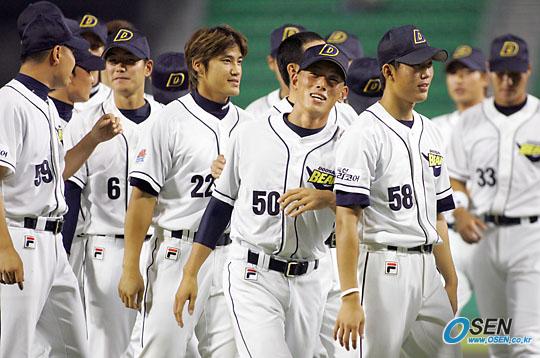 10일 기아 타이거즈의 잠실 경기서 두산이 8회말 대거 5점을 뽑아 6-5로 역전승했다. 8회초 2사 후 등판,한 타자만 잡고 행운의 승리 투수가 된 박정배(50번)가 경기 후 동료들과 함께 기뻐하고 있다./잠실=주지영 기자 jj0jj0@osen.co.kr [Copyright ⓒ OSEN(www.osen.co.kr) 무단전재 및 재배포 금지]