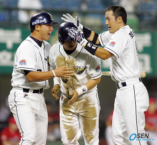 10일 두산 베어스와 기아 타이거즈의 잠실 경기 3-5로 뒤지고 있던 두산의 8회말 2사 만루서 김창희의 좌전 안타 때 홈인한 3루 주자 정원석(왼쪽)과 다음 타자 최경환(오른쪽)이 2루 주자 방승재가 홈을 밟아 동점이 되자 환호하고 있다./잠실=주지영 기자 jj0jj0@osen.co.kr [Copyright ⓒ OSEN(www.osen.co.kr) 무단전재 및 재배포 금지]