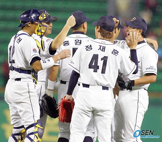 10일 두산 베어스와 기아 타이거즈의 잠실 경기서 8회말 대거 5점을 뽑아 6-5로 역전승한 두산 선수들이 마운드 주변에 모여 짜릿한 승리의 기쁨을 만끽하고 있다./잠실=주지영 기자 jj0jj0@osen.co.kr [Copyright ⓒ OSEN(www.osen.co.kr) 무단전재 및 재배포 금지]