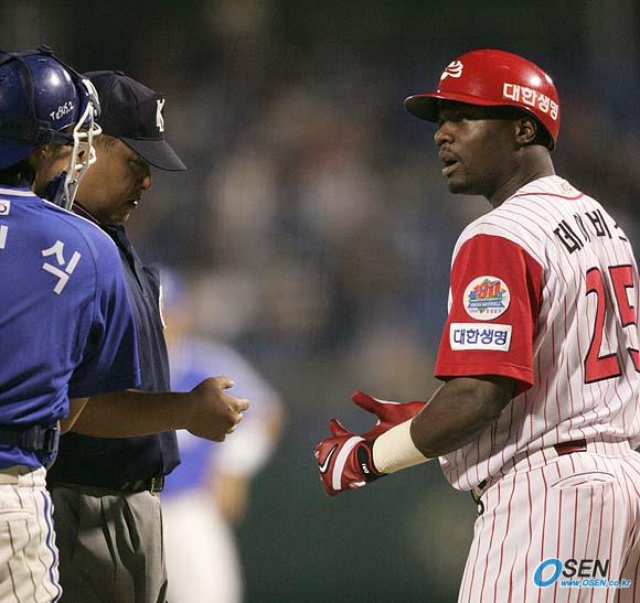 10일 대전구장에서 열린 한화 이글스와 삼성 라이온즈의 경기 한화의 7회말 1사 1루서 오상민의 투구에 손부분을 살짝 스친 데이비스가 1루로 걸어나가자 주심과 삼성 포수 이정식이 맞은 부위를 보여달라고 요청하고 있다./대전=손용호 기자 spjj@osen.co.kr [Copyright ⓒ OSEN(www.osen.co.kr) 무단전재 및 재배포 금지]