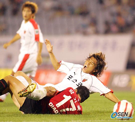 11일 부천 종합운동장에서 벌어진 부천 SK와 포항 스틸러스의 경기 전반 포항의 김성근(위)이 부천의 박기욱과 공 다툼을 벌이다 한 데 엉켜 함께 그라운드에 나뒹굴고 있다./부천=주지영 기자 jj0jj0@osen.co.kr [Copyright ⓒ OSEN(www.osen.co.kr) 무단전재 및 재배포 금지]